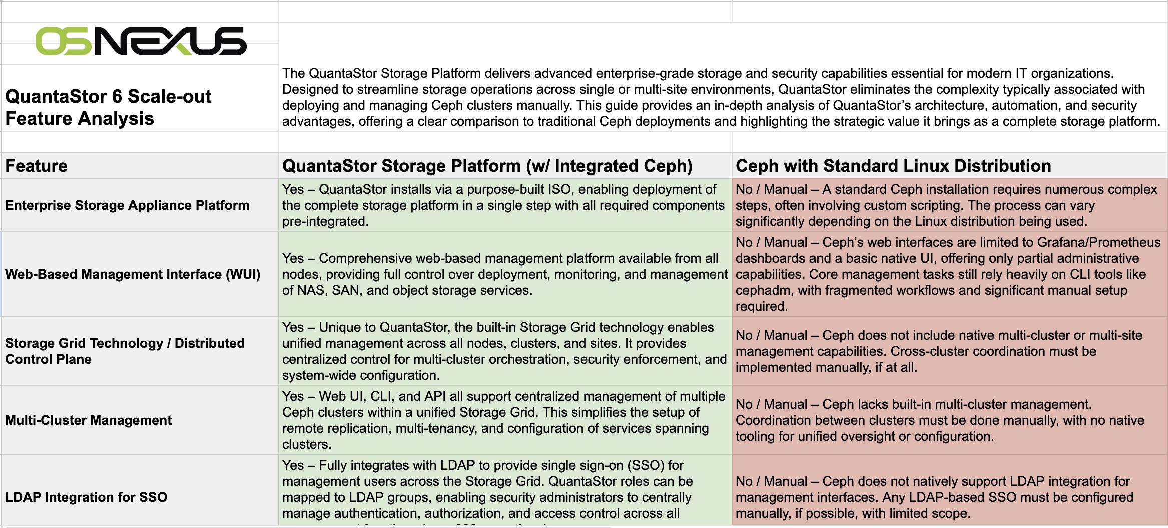 OSNexus QuantaStor solves this problem by elevating Ceph to enterprise class storage via the QuantaStor storage platform that fills the various security and management feature gaps and goes beyond traditional enterprise storage solutions with QuantaStor’s unique storage grid technology.