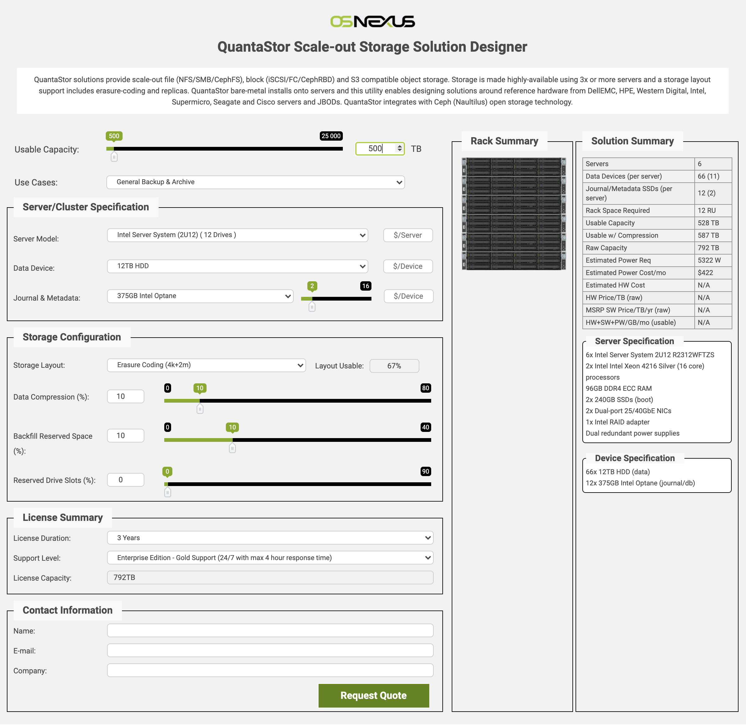 OSNexus provides web applications for designing storage solutions. This enables you to design solutions for your customers quickly and makes it easy to collaborate with your customer and the OSNexus Solution Engineering team. Once you're ready to have a configuration reviewed or if you just have general technical questions you can write us at sdr@osnexus.com (Solution Design Review) to get assistance.